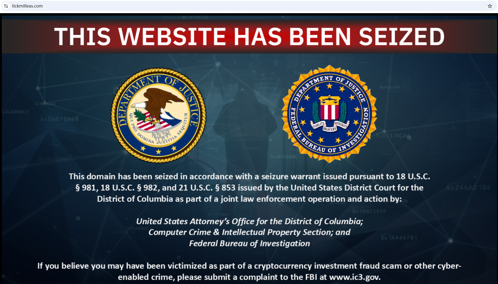 Currently, a seizure splash page warns visitors that the domain has been taken down by law enforcement. Based on its spelling, BrokersView believes that tickmilleas.com was likely impersonating the legitimate broker Tickmill. Fraudulent schemes often misuse the names and logos of regulated companies to mislead and defraud unsuspecting investors.
