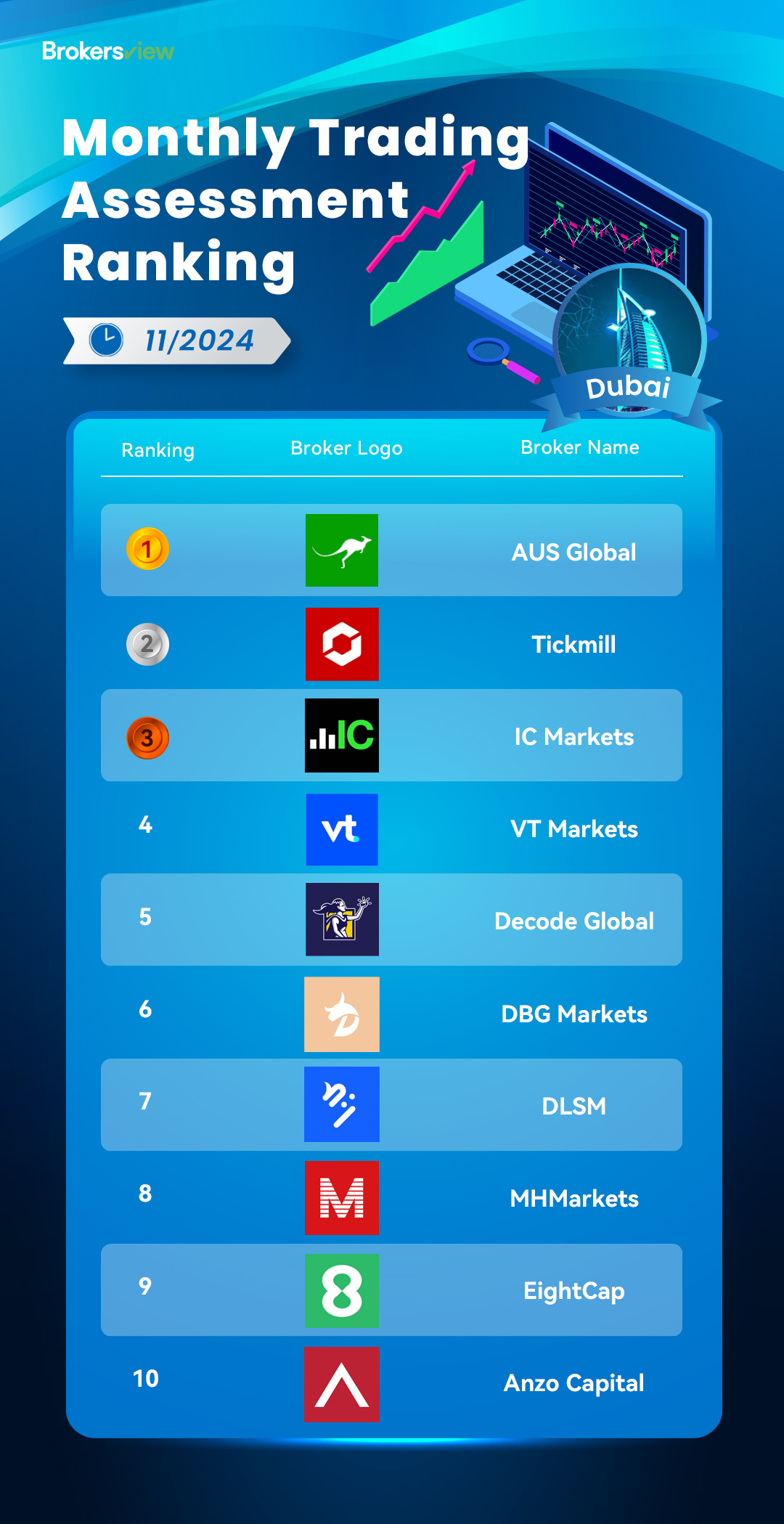 In November, BrokersView conducted an in-depth evaluation of broker performance across key trading categories. The results highlight AUS Global as the top performer, followed by Tickmill and IC Markets. Both AUS Global and IC Markets maintained their strong November rankings, showcasing consistent excellence.