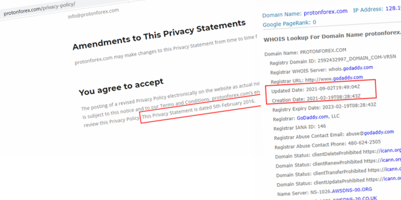 The firm showed on its "Privacy Policy" that its Privacy Statement is dated 5th February 2016. That means the company must be established before or not late than 2016. However, when we checked its domain, the result shows the firm was newly created in 2021. How could this happen? Is it reasonable for a company's policy occurred before the existence of the company itself? The answer is definitely "No", and the firm uses false and misleading information. Therefore, there is the highest possible level of caution for you when dealing with protonforex.com.