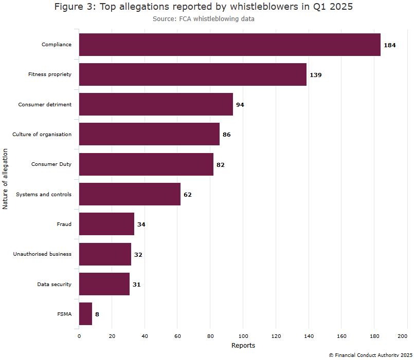 The FCA lists the top 10 allegations made in whistleblowing reports in Q1 2025.