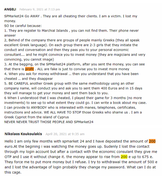 A few investor posted their scammed experiences with the scammer SPMarket24.