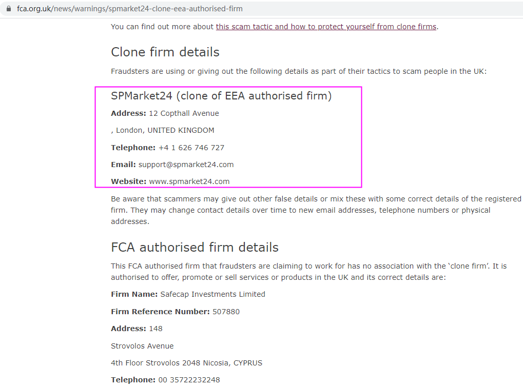The broker is operating under the website www.spmarket24.com(cannot be opened now) and claims to be subject to the supervision by the Financial Conduct Authority (FCA) with license number 507880. However, when we searched on FCA with the number and found that the fake broker is warned by FCA. The SPMarket24 is a clone of EEA authorised firm and has no legal license.