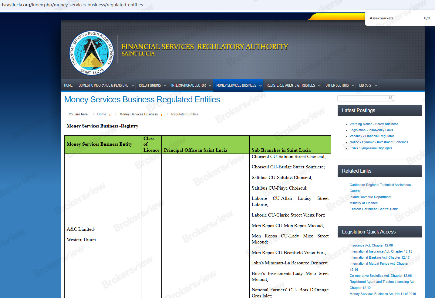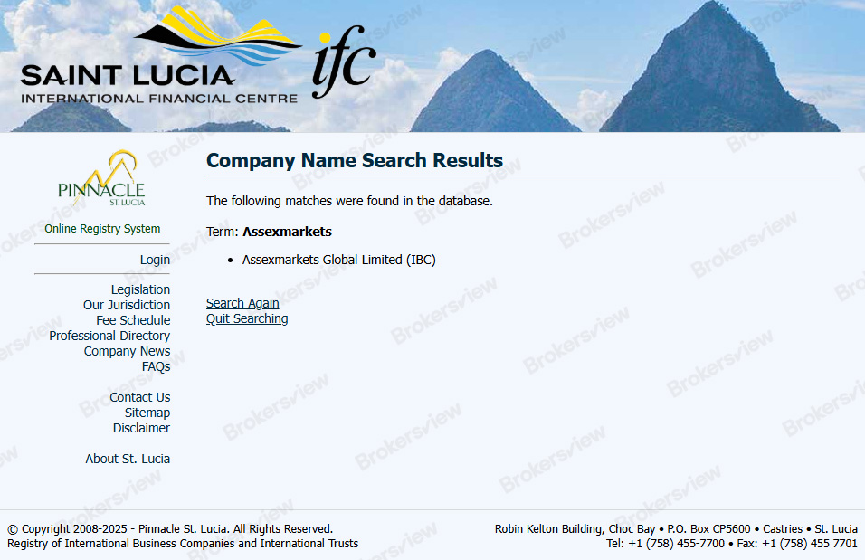 Assexmarkets Global Ltd publicly claims to be authorised by the Financial Services Regulatory Authority (FSRA) of Saint Lucia with registration number 2024-00223. However, an investigation reveals that no record of Assexmarkets Global Ltd could be found in the FSRA’s list of regulated entities. Even if it is listed, the FSRA itself does not license or supervise forex trading or derivative brokerage services.