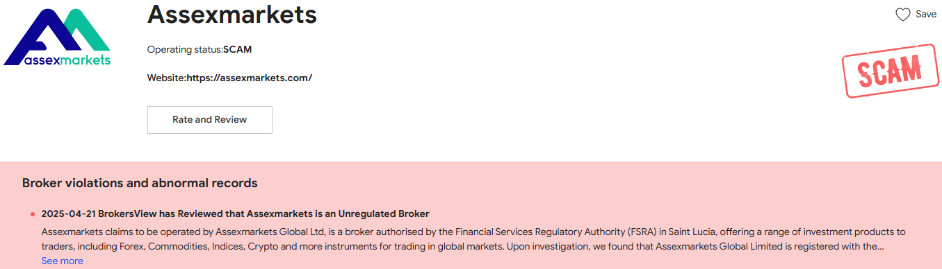 BrokersView has listed Assexmarkets as a Scam Broker.