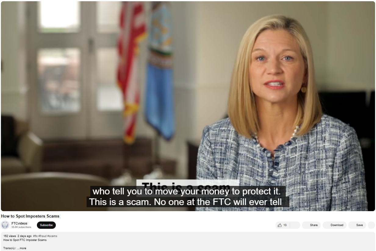 To help consumers recognize and avoid such schemes, the FTC has released a video titled “How to Spot Imposter Scams” on its official YouTube channel.