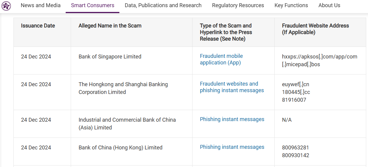On December 24, 2024, the Hong Kong Monetary Authority (HKMA) issued three consecutive alerts regarding fraudulent websites and phishing instant messages. These scams impersonated major banks, including the Hongkong and Shanghai Banking Corporation Limited, Industrial and Commercial Bank of China (Asia) Limited, and Bank of China (Hong Kong) Limited.