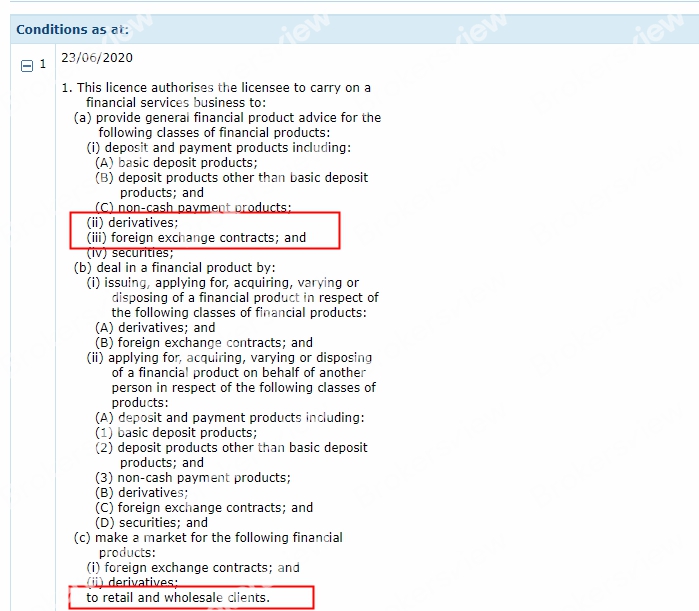 3. You will have access to the dealer's content on the ASIC website. At this point you will click on the 'License Authorization Conditions' and check whether the dealer has the right to offer 'foreign exchange contracts or derivatives' to retail customers; If not, it means that the dealer does not have the right to conduct foreign exchange trading services, please take precautions. If yes, proceed to the following steps.
