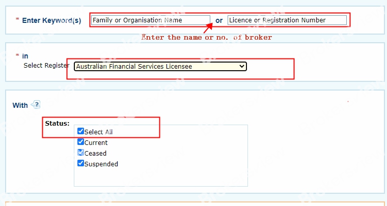 1. Log in to the ASIC official website http://www.asic.gov.au/ find the license number/reference number (preferred) or the name of the broker on the broker's webpage;