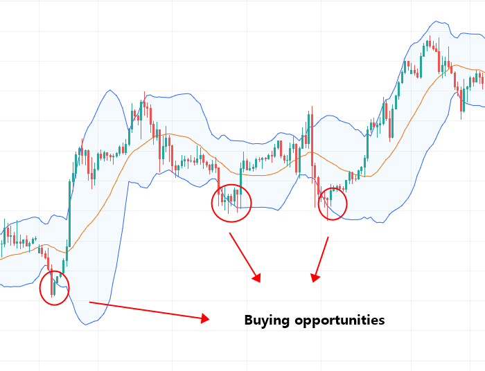 Conversely, when the price approaches the lower band, the asset is considered oversold since it is trading at a relatively low price compared to its recent average. This logically is deemed a bullish signal because the price will likely rebound and retrace back to the moving average. The most logical action here is to close your short positions and place long orders.