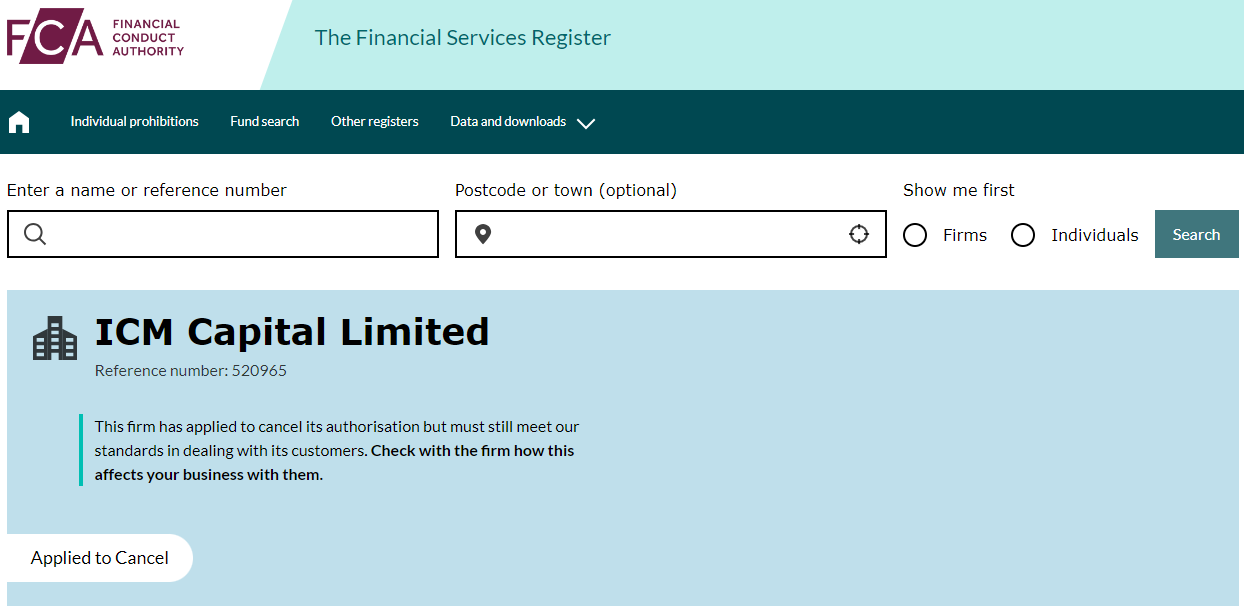 UK retail FX and CFD broker ICM.com has applied to the Financial Conduct Authority (FCA) to cancel the license of its UK subsidiary ICM Capital Limited (No. 520965). The exact reasons for the application have not been disclosed.