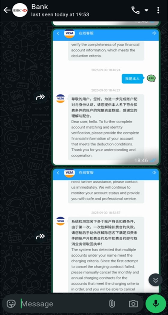 Victims typically receive unsolicited calls claiming that payments will be auto-deducted for services such as Alipay Account Upgrade or Payment Agreements. To cancel, they are redirected to other scammers impersonating bank staff or payment service providers via messaging platforms.