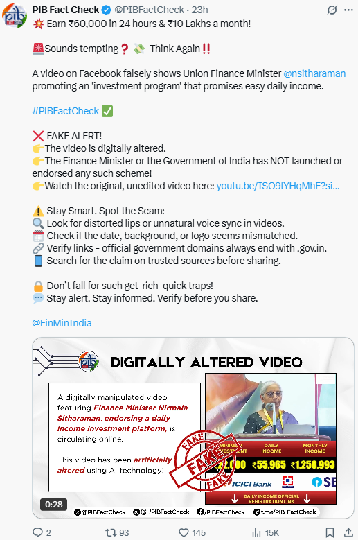 PIB urged the public not to fall for such get-rich-quick traps and advised users to verify any financial claims before taking action. To help identify manipulated content, PIB recommended watching for distorted lip movements, unnatural voice synchronization, and inconsistencies in the date, background, or logos appearing in the video.