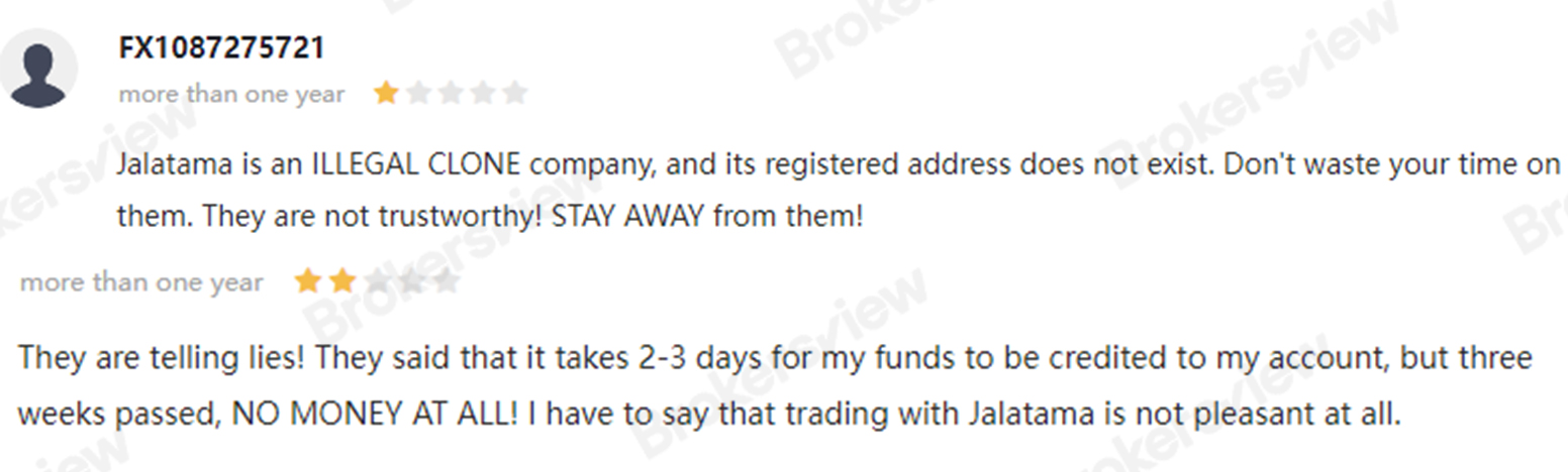 Client feedback on Jalatama Artha Berjangka is predominantly negative. Some clients accuse it of being an illegal clone with a non-existent registered address, while others report significant delays in fund transfers, contradicting the company's promises. Two reviews highlighted concerns about trustworthiness and service reliability.