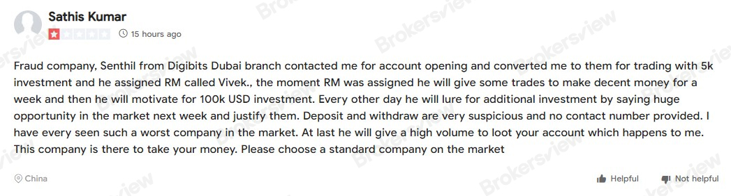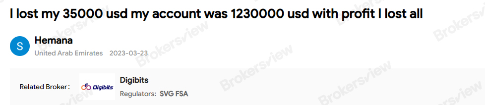 Recently, the spike in complaints about Digibits has caught the attention of BrokersView. Investors have accused it of engaging in dubious practices, including profiting from client losses, not processing withdrawal requests, and trading against clients' best interests. Shockingly, in one particular case, a victim suffered an alarming loss of $35,000.