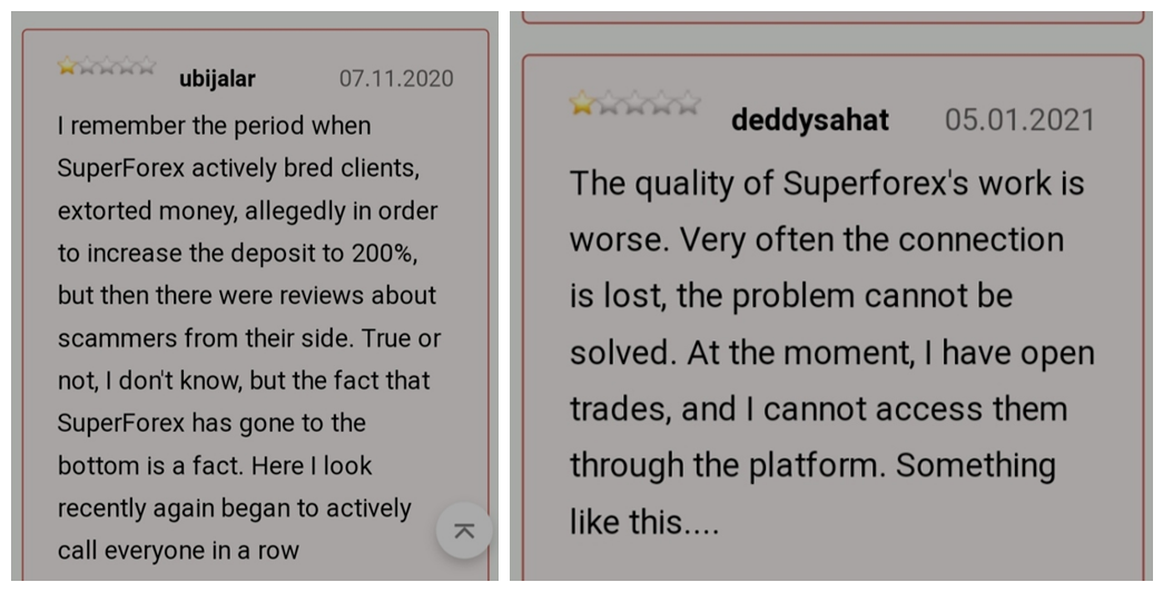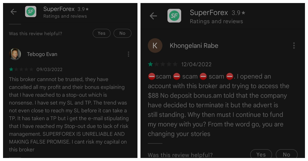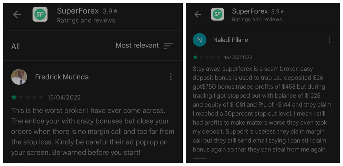 Many beginners trader have been scammed by this SuperForex No Deposit Bonus, while others have complained about additional issues. Here are some screenshots from the Google Play Store.