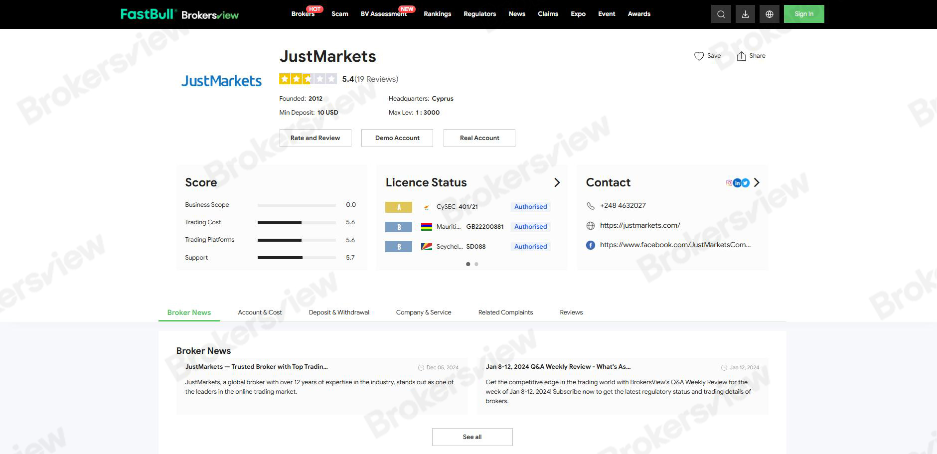 From a regulatory standpoint, BrokersView's review page shows that JustMarkets holds multiple licenses from authorities including the Cyprus Securities and Exchange Commission (CySEC), the Mauritius Financial Services Commission (FSC), the Seychelles Financial Services Authority (FSA), and the South African Financial Sector Conduct Authority (FSCA), placing it within the ranks of compliant brokers.