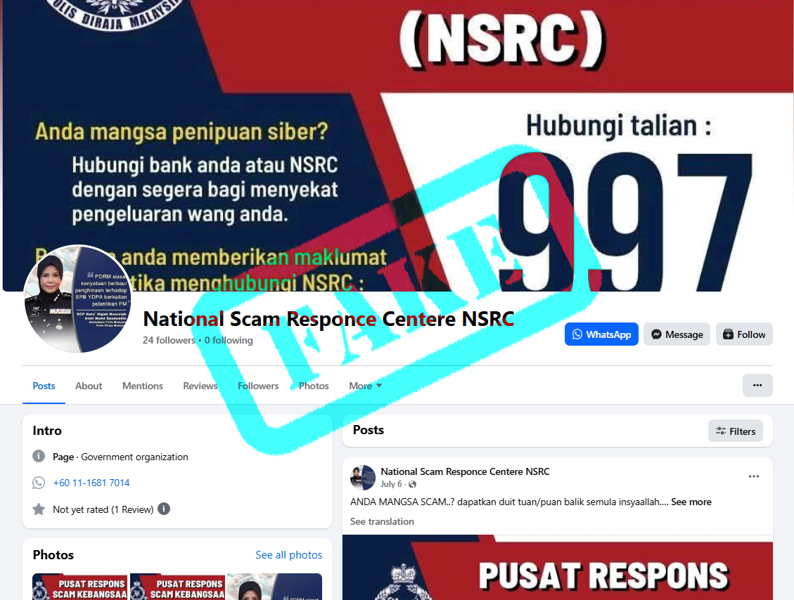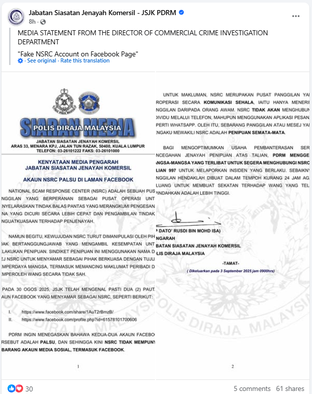 The Commercial Crime Investigation Department (CCID) of the Royal Malaysia Police (PDRM) has identified two fake Facebook accounts falsely claiming to represent the National Scam Response Centre (NSRC):