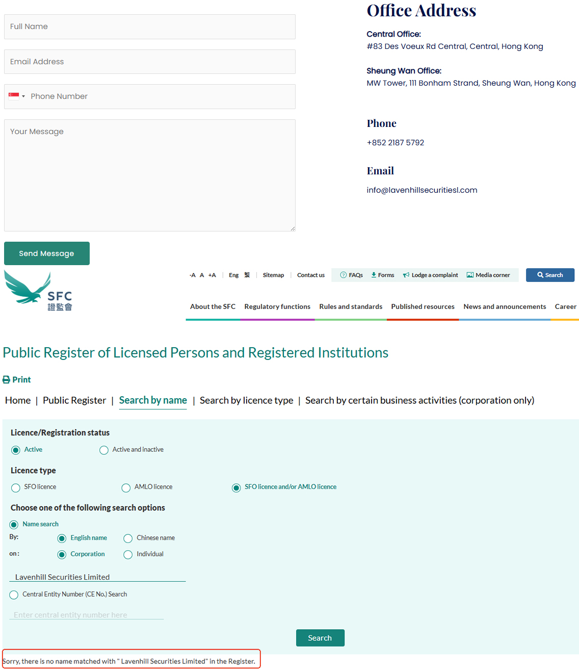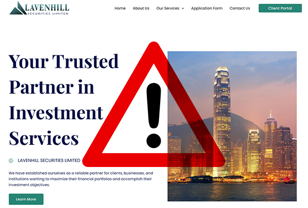 In addition, Lavenhill Securities Limited lists an office address in Hong Kong. A search of the Securities and Futures Commission (SFC) public registry found no matching entry, suggesting the firm is also operating without authorization in Hong Kong.