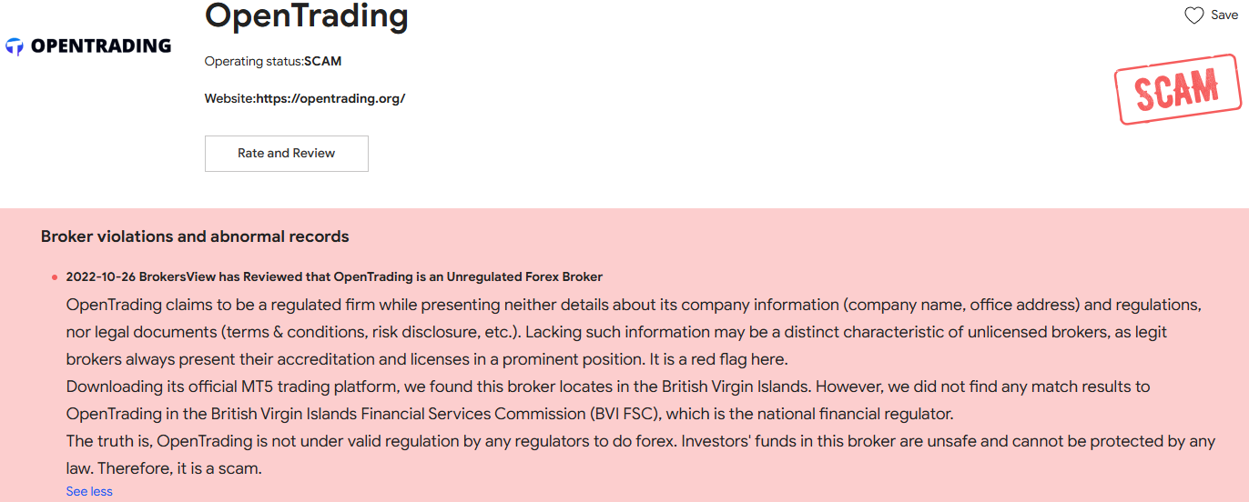Investors should avoid dealing with OpenTrading due to its lack of credible regulation and transparency. BrokersView labeled the company as a Scam back in 2022 due to its unregulated operations as a forex broker.
