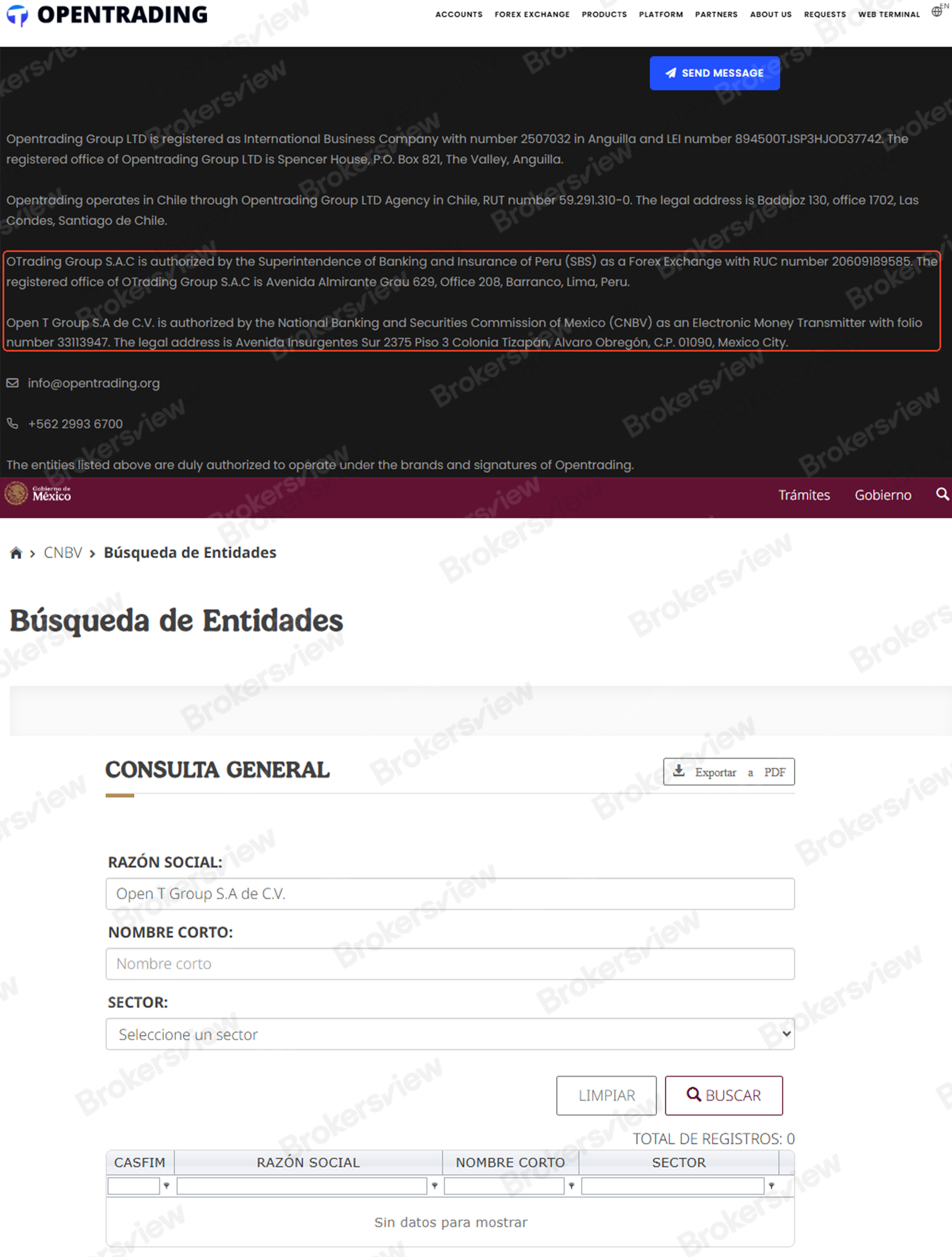OpenTrading claims to be regulated by Peru's Superintendence of Banking and Insurance (SBS) and Mexico's National Banking and Securities Commission (CNBV). However, none of these authorities regulates forex brokers. In addition, our investigation found no matching record to Open T Group S.A de C.V. in CNBV’s database, which indicates the company’s false regulatory claim.