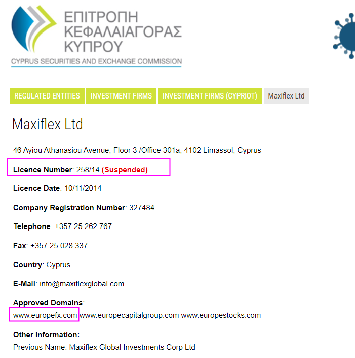 EuropeFX is registered as a CIF (license no. 258/14 ) of CySEC to operate as an investment firm. When checking on the CySEC register, we found the regulatory status of EuropeFX changed into “Suspended”.