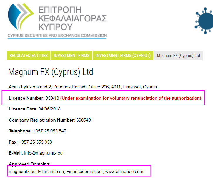 ETFinance is registered as an CIF (license no. 359/18 ) of CySEC to operate as an investment firm. When checking on the CySEC register, we found the regulatory status of ETFinance changed into under examination for voluntary renunciation of the authorisation.