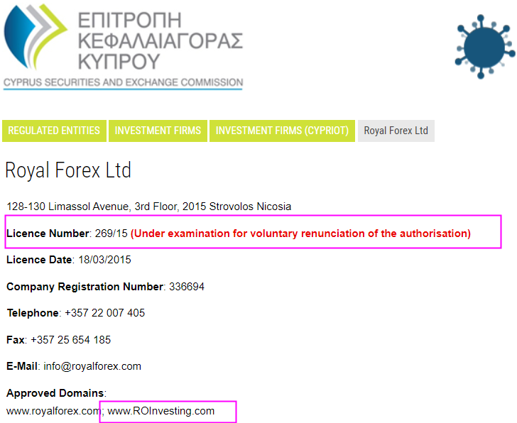 ROinvesting is registered as an CIF (license no. 269/15 ) of CySEC to operate as an investment firm. When checking on the CySEC register, we found the regulatory status of ROinvesting changed into under examination for voluntary renunciation of the authorisation.