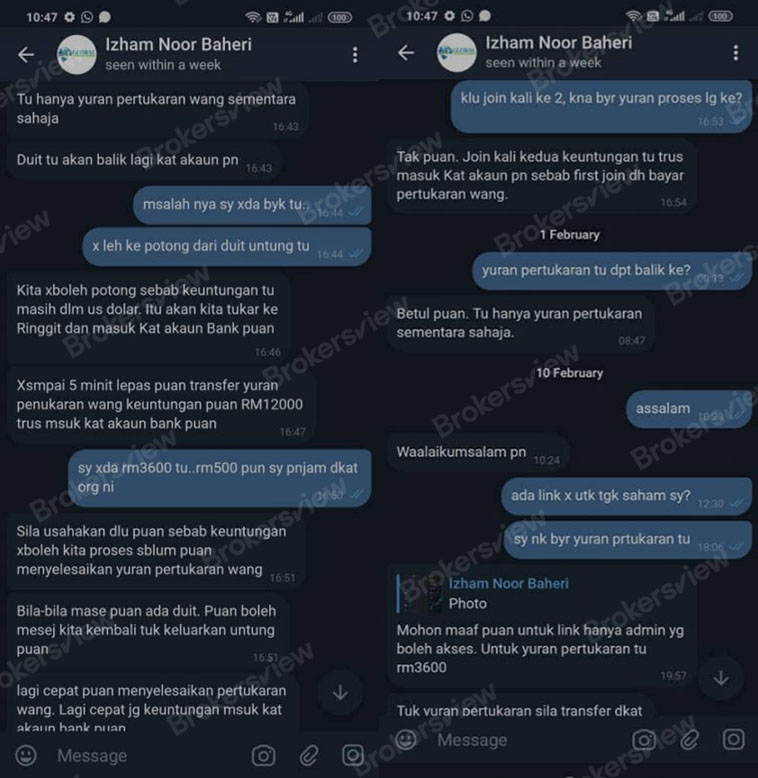 A few days later, GIN told the investor that she has made a profit of $2820.54. However, due to the exchange rate, the withdrawal would require RM3600 to secure the account. According to the fraudster, the fee was only a temporary deposit that would eventually be returned to the victim's account and would not need to be paid again for future transactions.