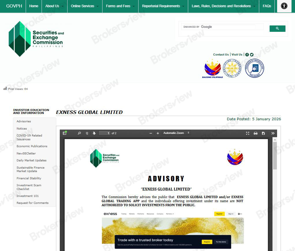 The Philippine Securities and Exchange Commission (SEC) has issued a public advisory warning that EXNESS GLOBAL LIMITED, its associated trading application, and individuals acting under its name are not authorised to solicit investments in the country.