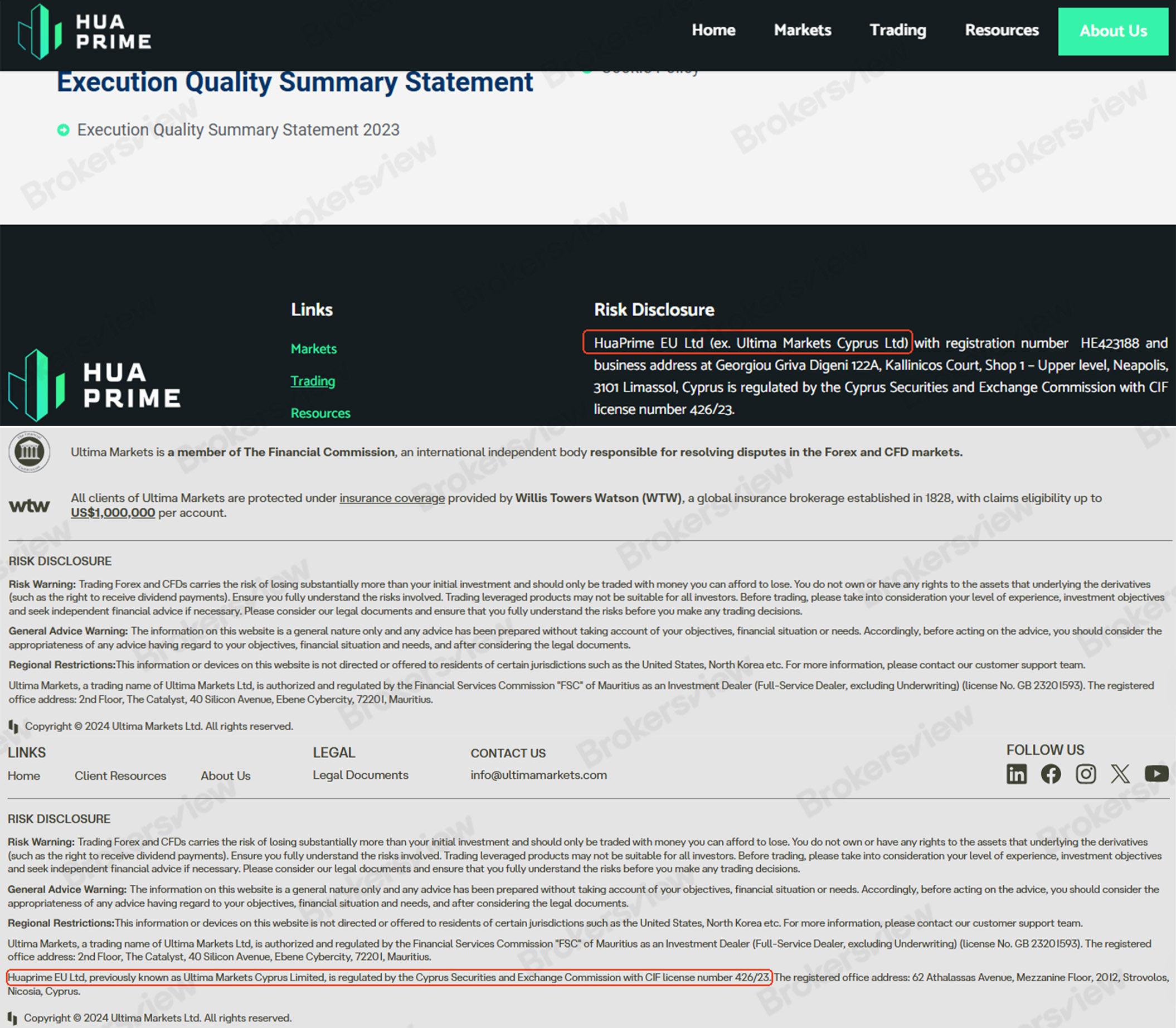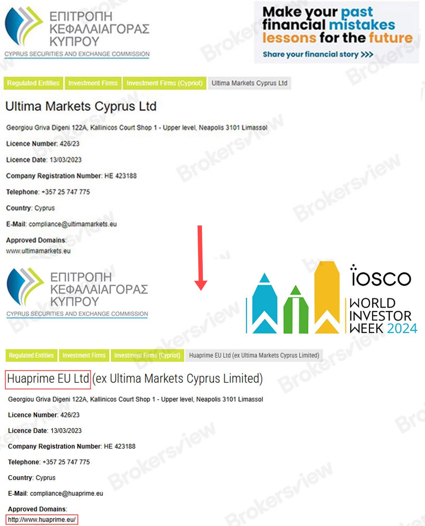 https://huaprime.eu/ does not mention that Ultima Markets Cyprus Ltd has undergone this change, although Ultima Markets Cyprus Ltd is listed as the former name in the license disclosure on the new website. The website of Ultima Markets’ Mauritius entity also does not mention this new Cyprus entity either, yet the website page used by the entity for promotion does refer to Huaprime EU Ltd as the new name of its Cyprus entity. This ambiguity raises concerns and suspicion.