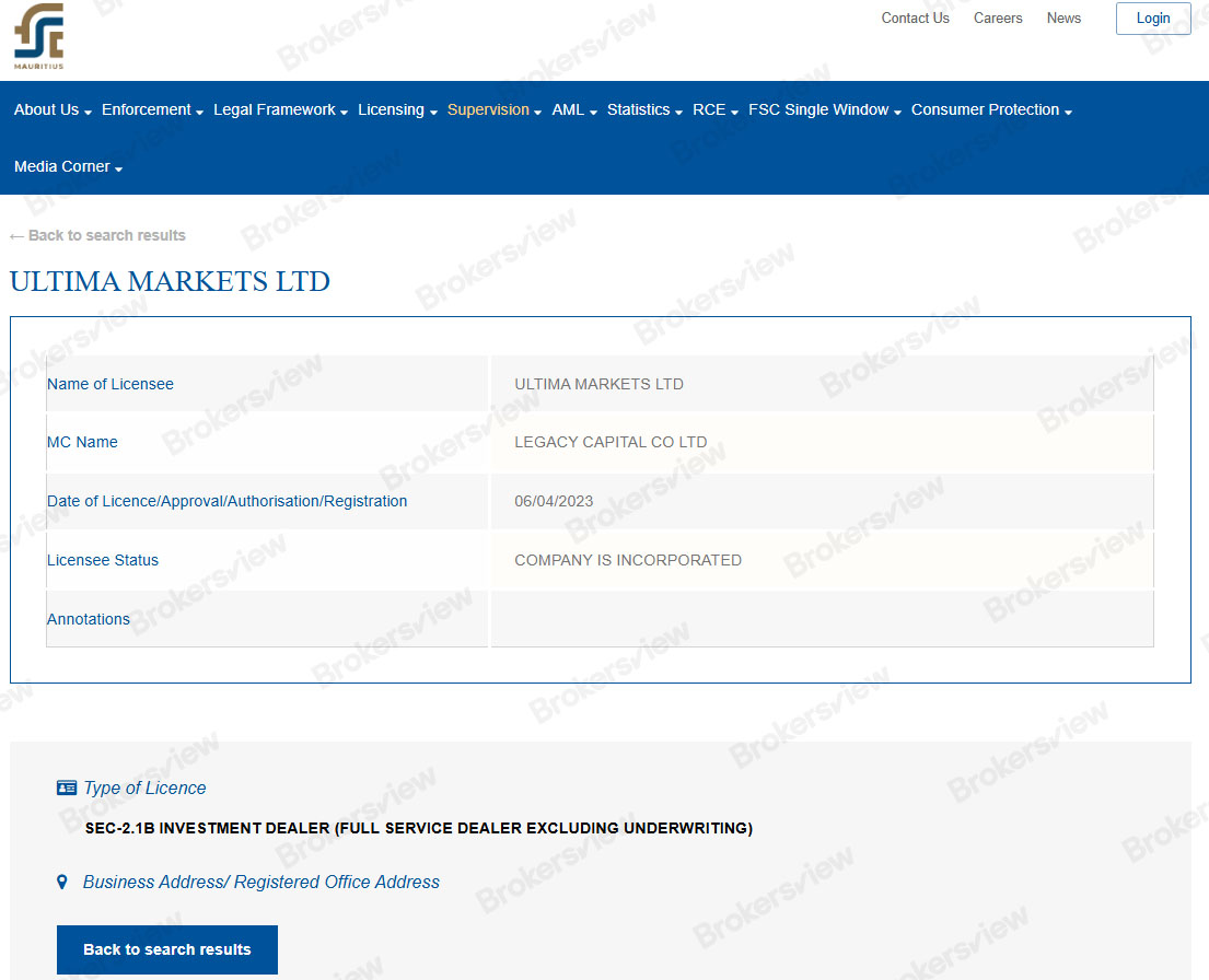 Ultima Markets Ltd is authorized and regulated by the Financial Services Commission (FSC) of Mauritius as an Investment Dealer. However, the firm’s details in the regulator’s licensee registry do not include essential information such as address, email, telephone, and website, making it difficult to verify and raising uncertainty about its license ownership.