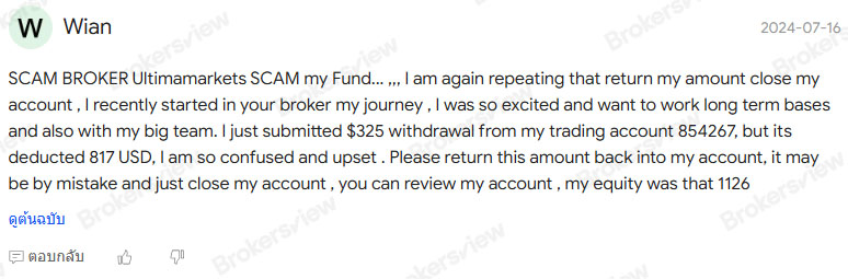 In June, BrokersView reported an incident where an Ultima Markets client was blocked from withdrawing funds. In July, a client left a comment alleging that Ultima Markets is a scam broker. The client reported that $817 was deducted from his trading account after submitting a withdrawal request for $325, causing confusion and frustration.
