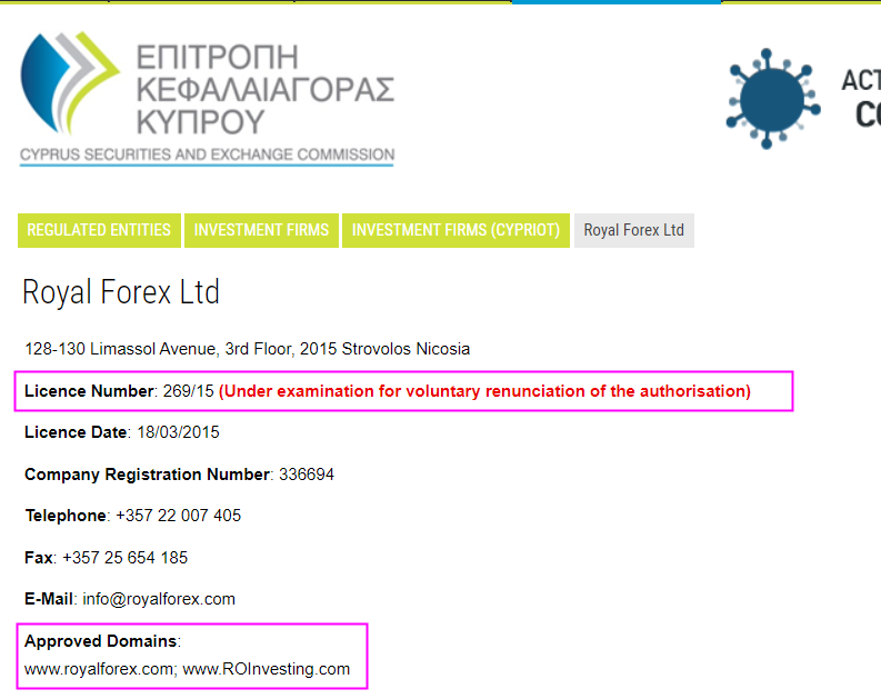 When checking on the CySEC register, we found the regulatory status of Royal Forex changed into under examination for voluntary renunciation of the authorisation. That means the Royal Forex’s surrender of license is entirely voluntary based on the company’s decision and does not arise as a result of any regulatory action.