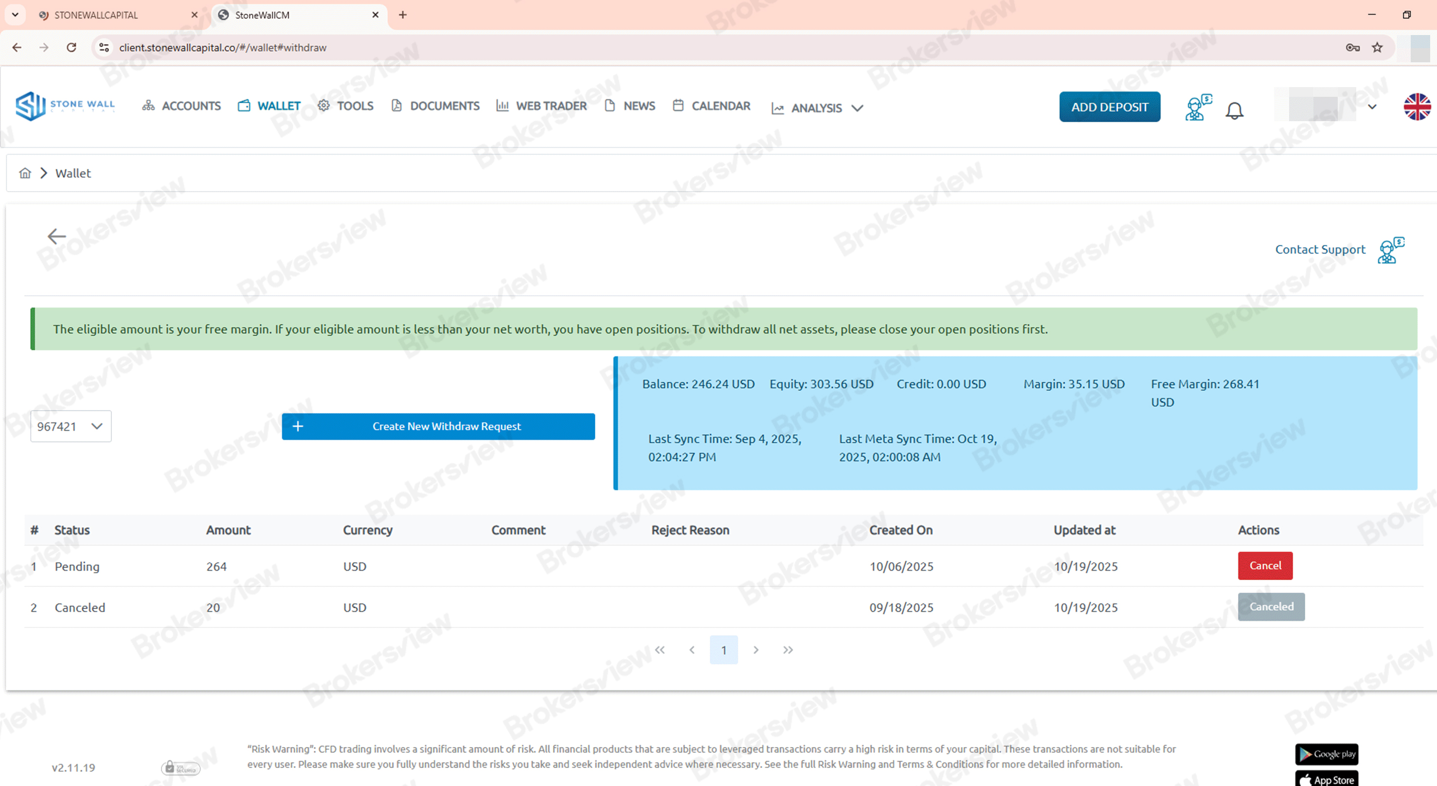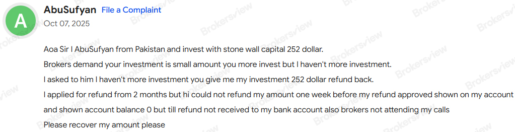 Muhammad Feroz from Pakistan reported that his $264 withdrawal has remained pending since his request on October 6. Stonewall Capital has not responded to his inquiries, and communication has ceased entirely.