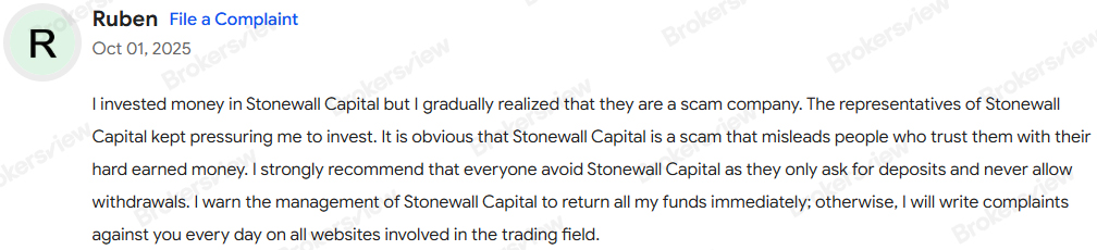 A third complainant stated bluntly: “Stonewall Capital only asks for deposits and never allows withdrawals.” He warned others to avoid the platform.