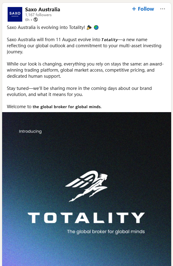 On July 1, Saxo Australia announced on social media that it will rebrand as Totality, effective August 11, 2025.