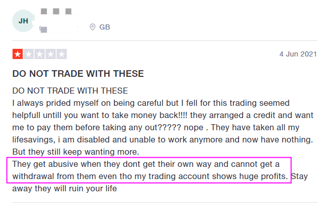 They get abusive when they don't get their own way and cannot get a withdrawal from them even tho my trading account shows huge profits. Stay away they will ruin your life”.