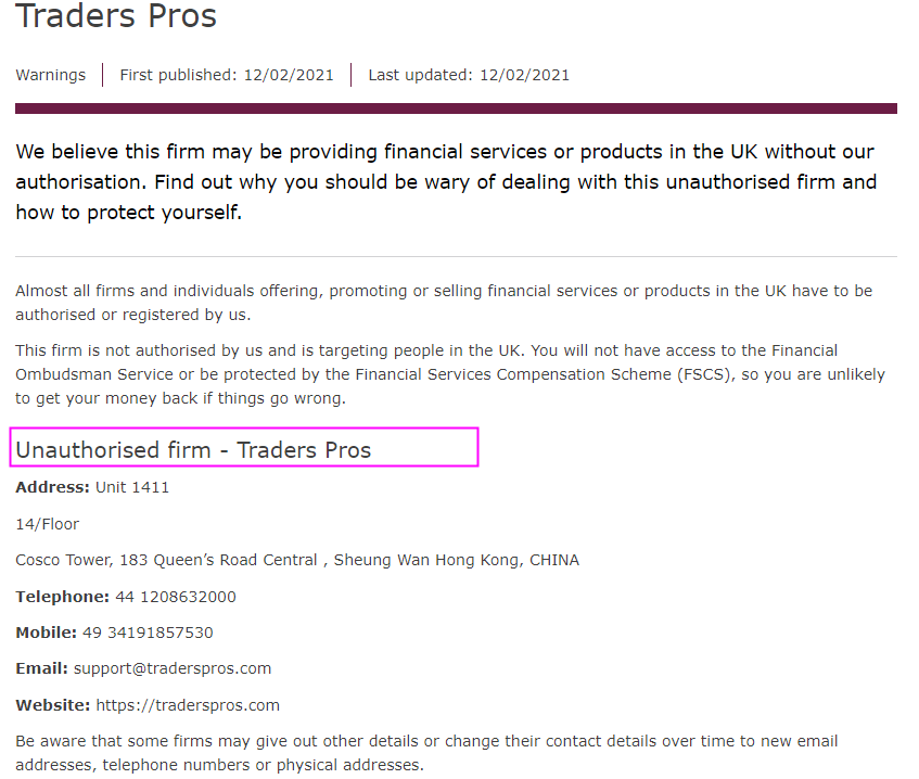 Traders Pros shows on its page that it provides customers with forex currencies, indices and other trading assets. At the same time, it also claims that it is regulated by Global Financial Authority(GFA). However, GFA doesn't regulate forex activities. What's more, based on the information we get, the UK FCA has issued a public warning against Traders Pros,