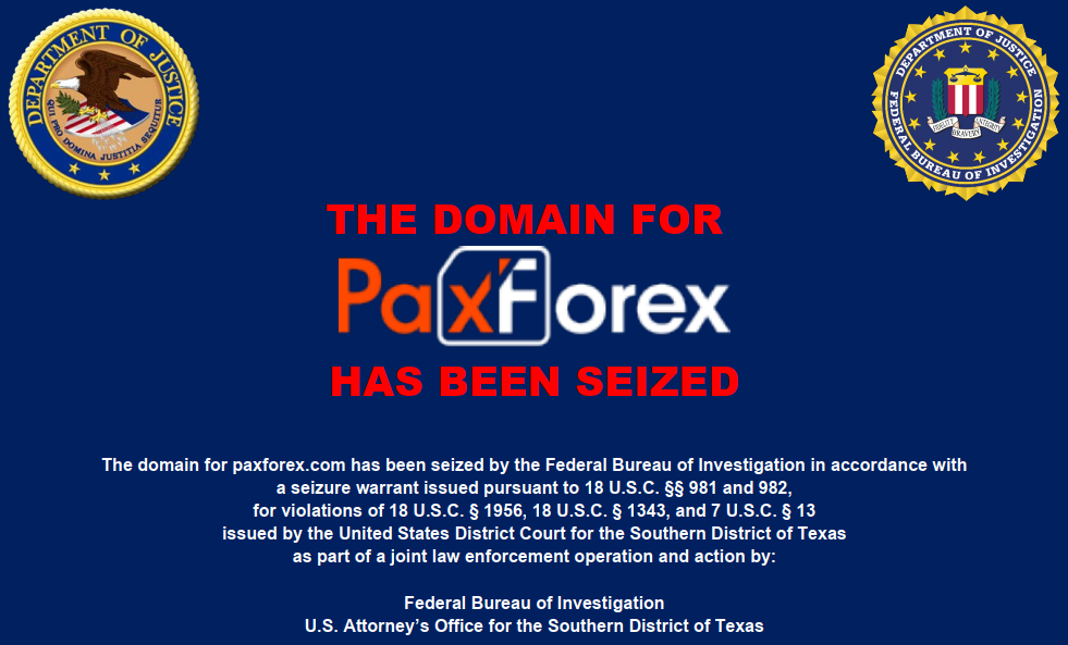 Lastly, the most prevalent proof of the broker being a scam entity is the seizure of the company's official domain www.PaxForex.com by the Federal Bureau of Investigation in line with the warrant issued by the United States District Court for the Southern District of Texas.