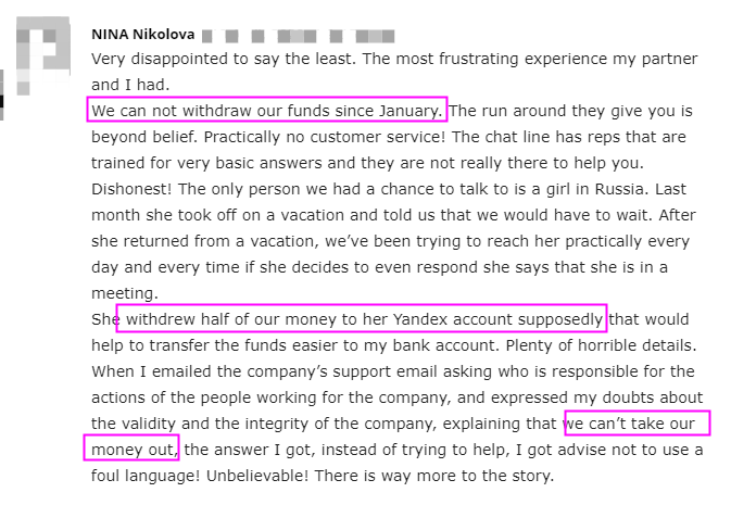 One client posted that he could not withdraw his money from Hamilton Club. He can not withdraw his funds since January last year, and customer service was non-responsive. The chat line has reps that were trained for very basic answers and they were not really there to help him. The only person he had a chance to talk to was a girl in Russia. The girl told him to wait because she was on vacation when she received his call. After she returned from a vacation, he has been trying to reach her practically every day and every time, but the result was she withdrew half of his money to her Yandex account supposedly that would help to transfer the funds easier to his bank account. He found the girl's behavior was horrible, so he sent an email to explain his situation to the broker's support team, but finally, he still got no help and can't withdraw his money.