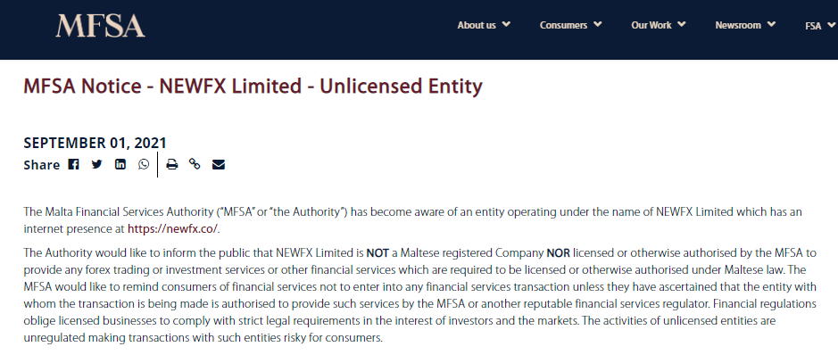 The non-regulated status of the broker is the foremost factor that makes the broker untrusted. Further, the company has a history of frequently changing its domain names. The company formerly operated under the domain name https://www.newfx.trading and https://www.newfx.co. The broker asserted that it was governed by the MFSA, Malta's regulatory body. When the MFSA and numerous other EU license providers issued an official warning, the company changed its domain to newfx.us and stated that it would no longer accept customers from the EU.