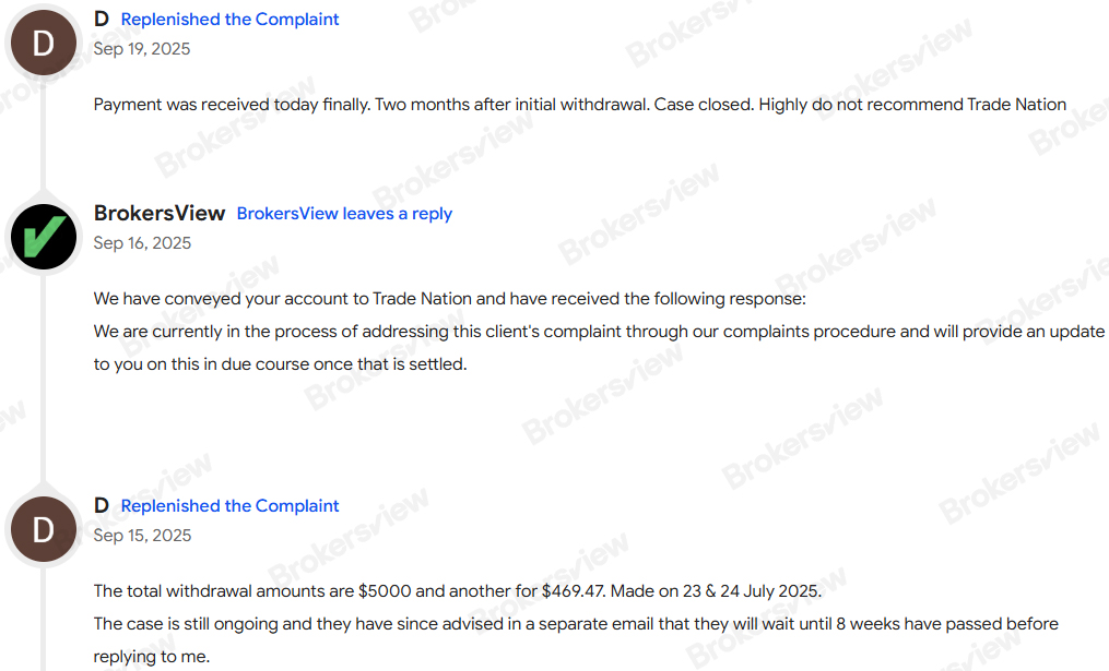 As of 19 September 2025, the client confirmed receipt of the withdrawn funds, nearly two months after the initial request. Although the case is now closed, the client maintains a negative stance toward Trade Nation due to the prolonged delay and does not recommend the broker.