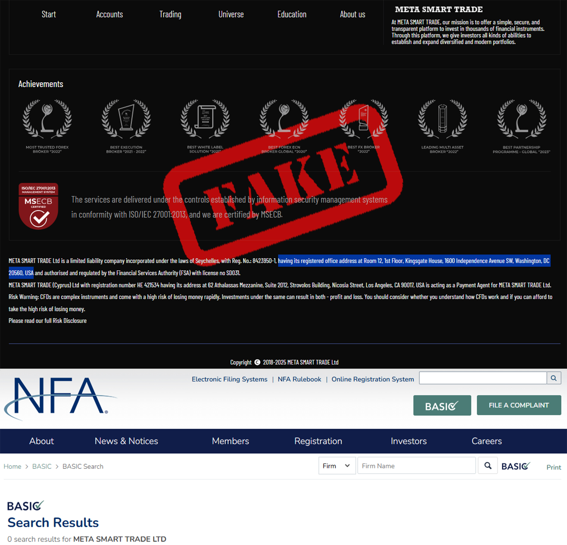BrokersView finds that META SMART TRADE Ltd also claims a U.S. office, but a search of the National Futures Association (NFA) registry yields no matching record.
