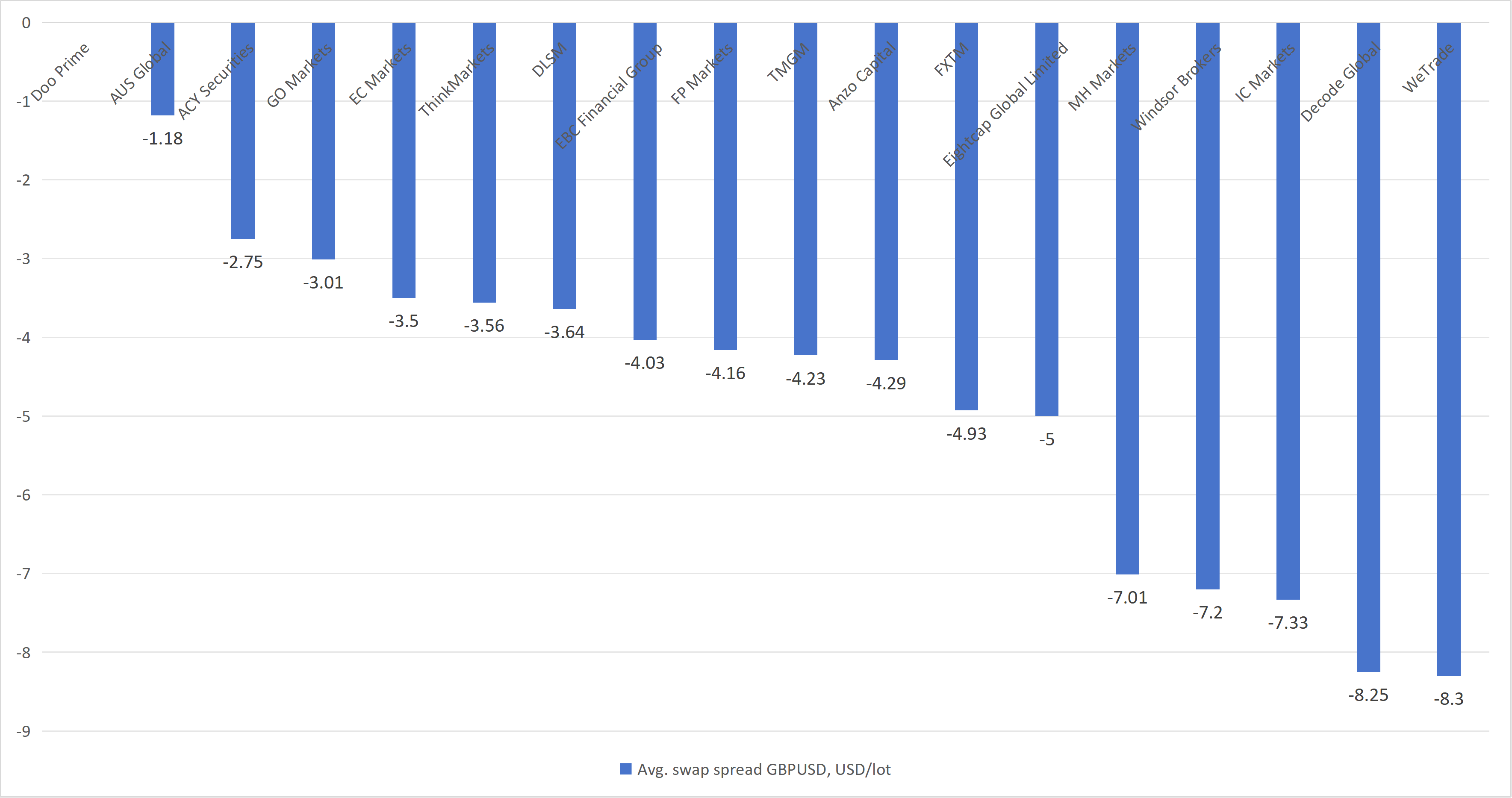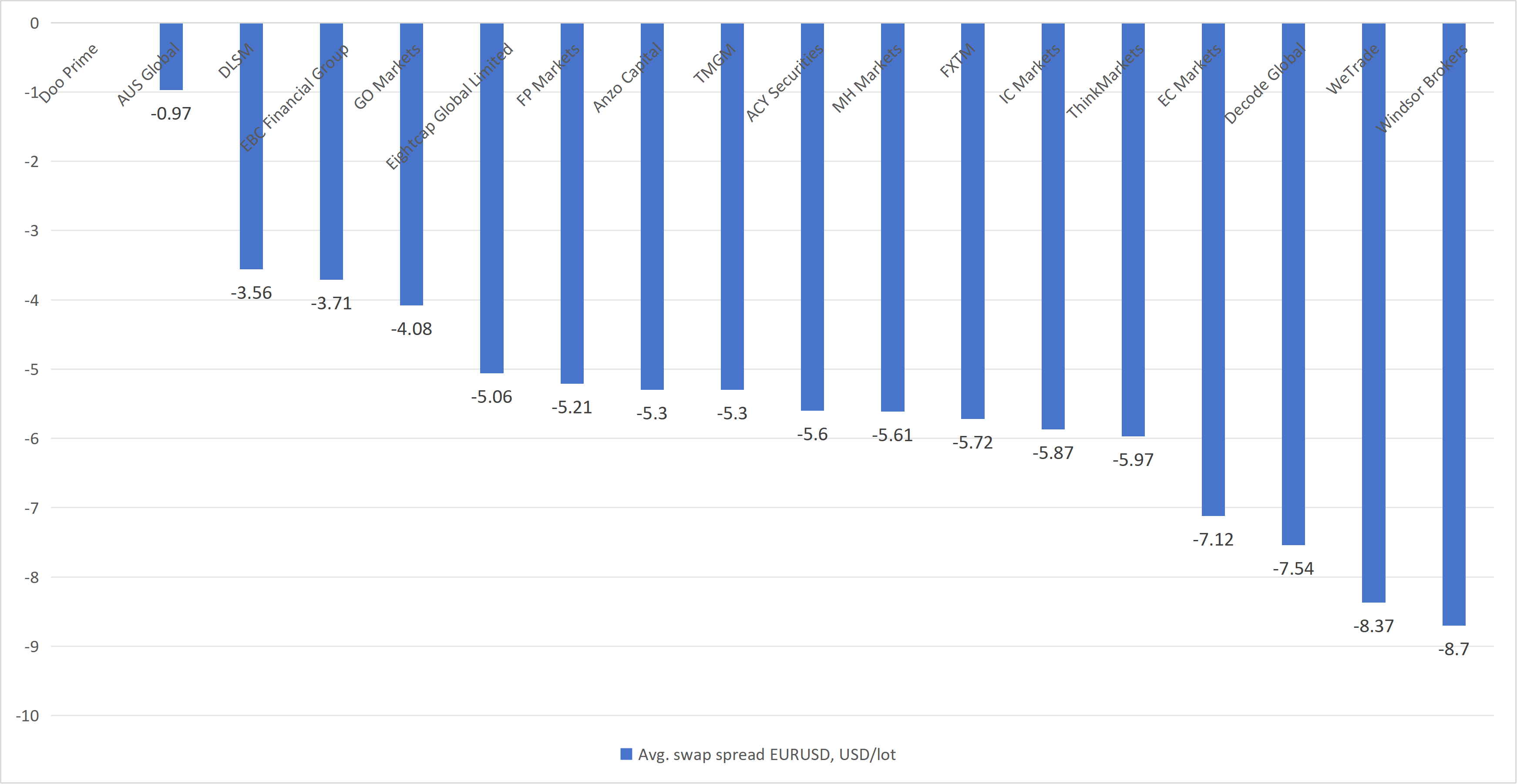 DLSM ranks third. Although its EURUSD swap is higher than Doo Prime and AUS Global, it still sits in a relatively competitive range compared with many mainstream brokers.