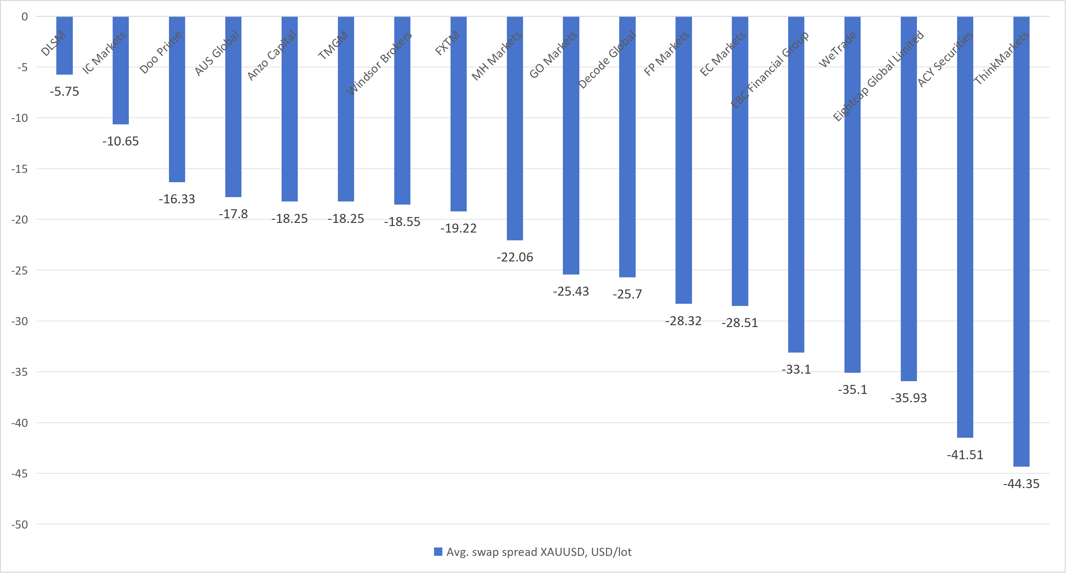 XAUUSD swaps vary significantly across brokers, from around -5.75 to over -44 USD/lot, making broker selection crucial for XAUUSD traders.
