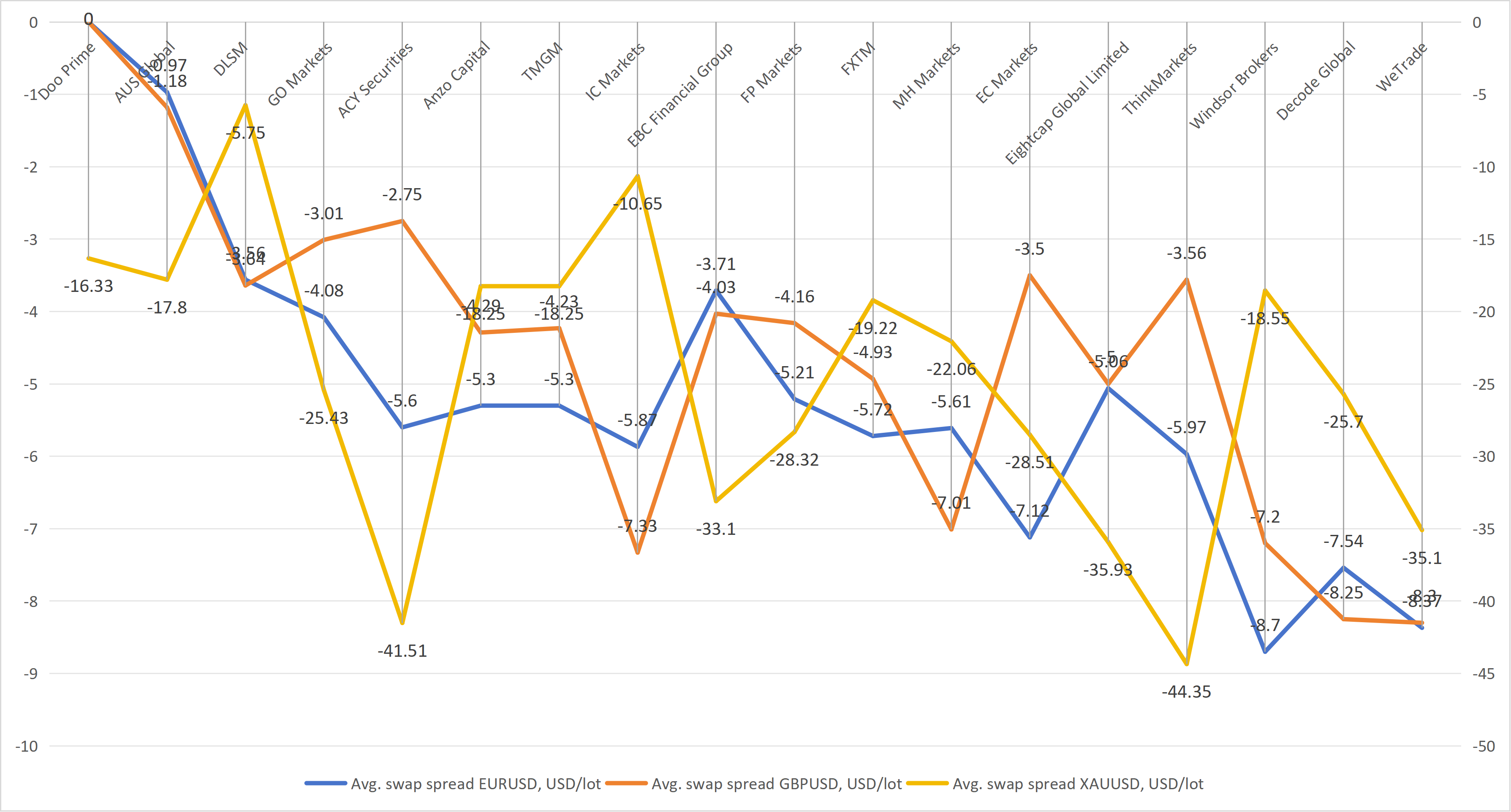 For gold traders, DLSM stands out with the lowest XAUUSD swap cost, while IC Markets and Doo Prime follow.