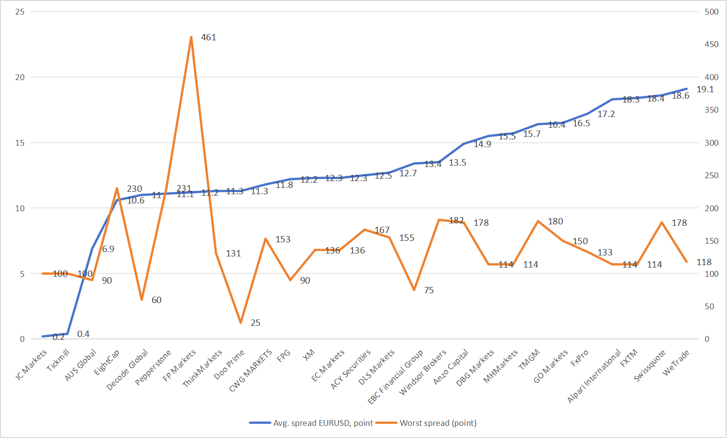 The following is a chart of average spreads of EURUSD currency pairs on 27 brokers↓↓↓
