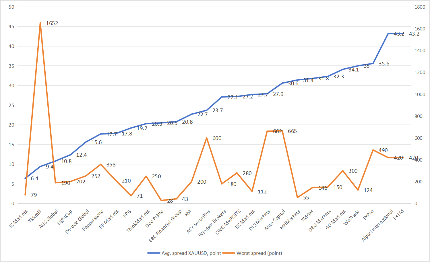 The following is a chart of average spreads of XAUUSD currency pairs on 26 brokers↓↓↓
