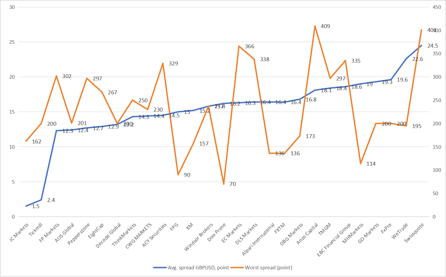 The following is a chart of average spreads of GBPUSD currency pairs on 27 brokers↓↓↓