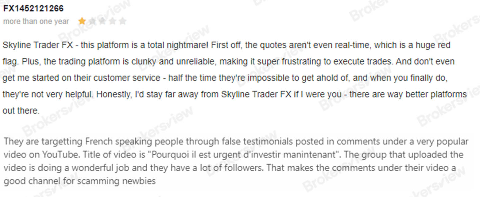 Client Feedback on Skyline Trader FX reveals a nightmare experience: real-time quotes are non-existent, the platform is unreliable, and customer service is elusive and unhelpful. Furthermore, there are allegations of targeting French-speaking individuals with false testimonials on a popular YouTube video, indicating a potential channel for scam activities.